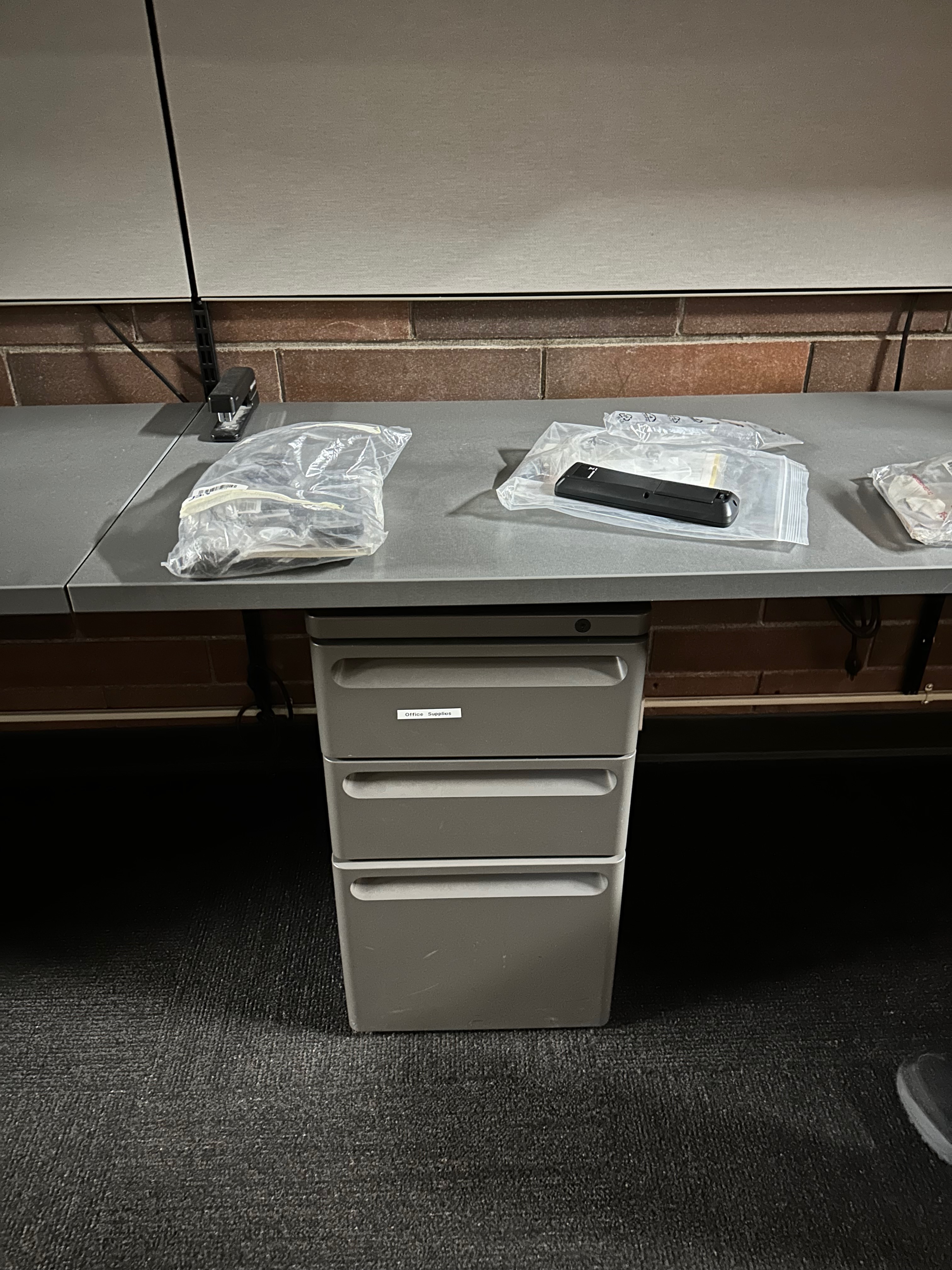 For the Library and LINC kiosks, remote controls are available to adjust monitor settings as needed. These remotes are located in the Western Building, stored in the office supplies cabinets. The location is shown in the picture below: