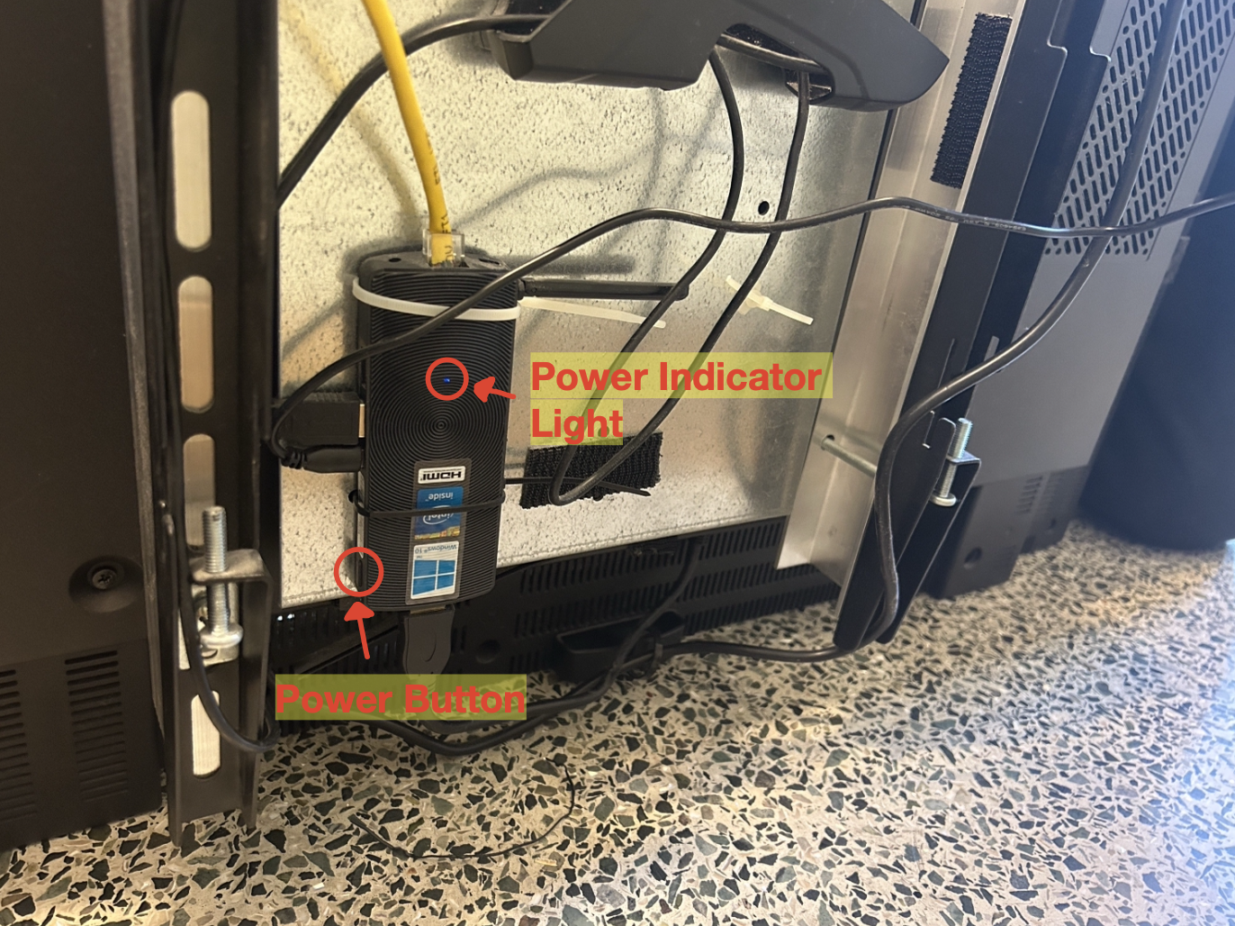 If for some reason you need hardware level access, the kiosk itself is on a mount which is easily detachable via unhooking the lock contraption on the bottom of the mount. Be careful when unhooking the lock, the kiosk may immediately start to fall. There should be a padlock keeping this detachable lock contraption in place, you will want to contact Mike Mayers (building manager at MU) for assistance (the padlock code).