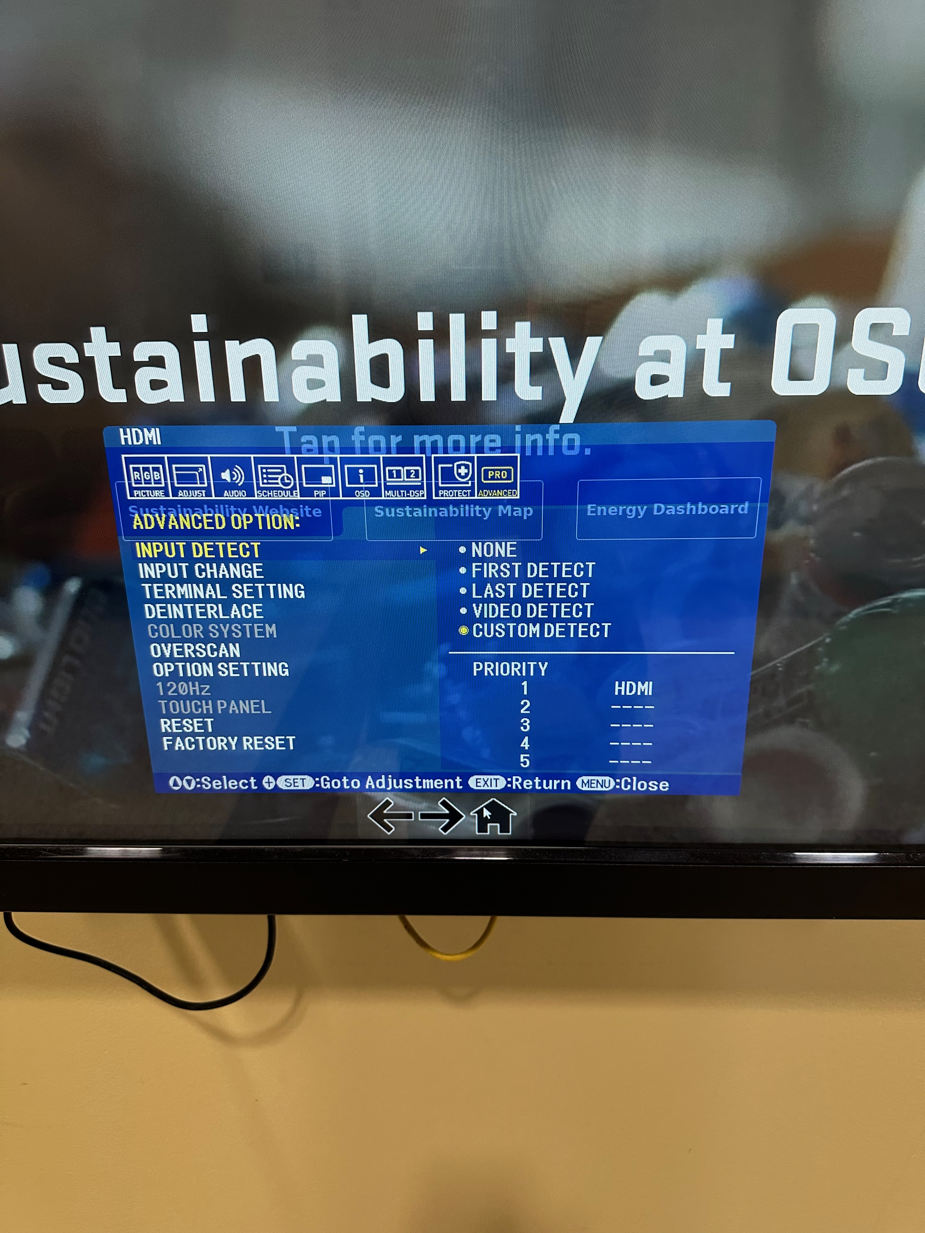 - Verify the input source. The computer connects to the monitor via HDMI. Use the buttons on the bottom of the monitor to open the settings menu and ensure HDMI is selected as the active input. It should look like the image below: